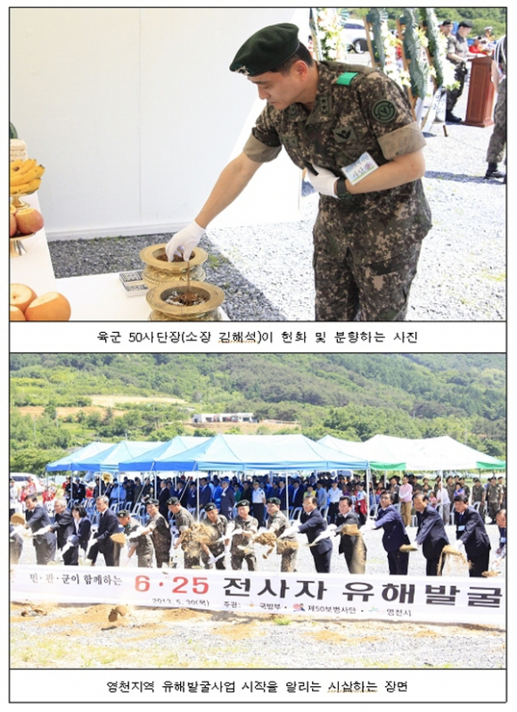 육군 제50보병사단과 국방부 유해발굴감식단은 5월 30일 영천시 화북면 舊 정각초등학교에서 50사단장 주관으로 6‧25전쟁 전사자 유해발굴 개토식을 갖고 6월 28일까지 4주간 영천지역에서 유해발굴을 실시한다.
