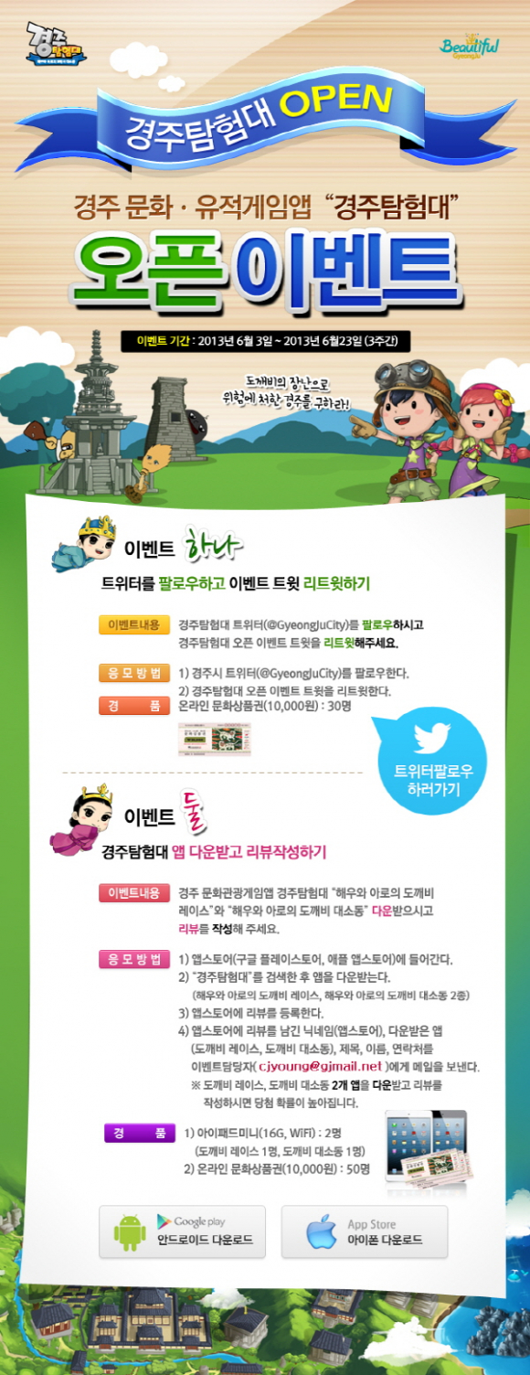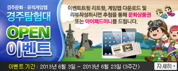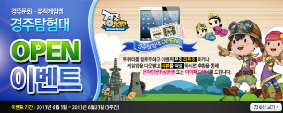 또, 앱스토어(구글 플레이스토어, 애플 앱스토어)에서 ‘경주탐험대’를 검색해 앱을 다운로드 받는 뒤 앱스토어에 리뷰(후기)를 남기고, 후기를 남긴 닉네임, 제목, 이름, 연락처를 이벤트 담당자(cjyoung@gjmail.net)에게 메일을 보내면 응모가 완료된다. 2개 게임 모두를 다운 받고 리뷰를 작성하면 당첨 확률이 높아진다. 추첨을 통해 당첨된 당첨자는 아이패드 미니(2명), 온라인 문화상품권(80명, 트위터 이벤트 30명, 리뷰작성 50명)을 경품으로 받을 수 있다.
