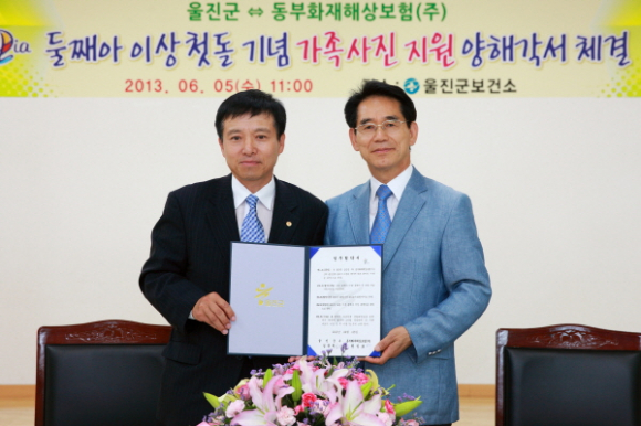 울진군(군수 임광원)은 6월 5일 울진군보건소에서 울진군 출생아건강보험사인 동부화재해상보험(주)와 둘째아 이상 첫돌기념 가족사진을 지원하는 양해각서를 체결한다.
