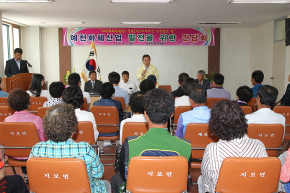 예천화훼작목반은 2006년도 이경호 작목반장을 비롯한 농가 10명이 수국, 맨드라미를 재배한 것이 계기가 되어 결성되었으며, 현재 지보면과 개포면 등지에서 18명의 회원이 백합, 수국, 튤립, 스톡(쌍떡잎식물 양귀비목과) 등을 2.9ha 재배해연간 6억원의 소득을 올리고 있다.