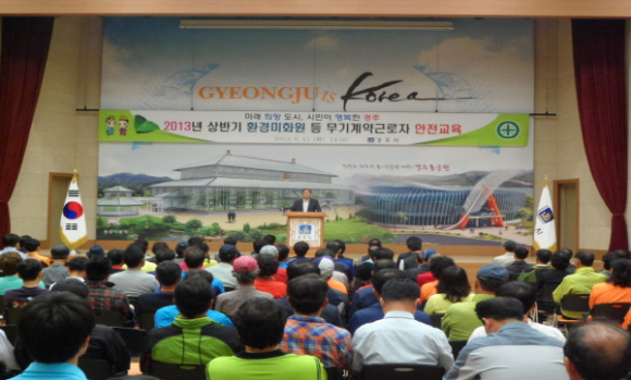 경주시는 환경미화원 등 무기계약 근로자와 생활쓰레기 수집운반업체 근로자, 경주시 자원화단지(재활용선별장, 음식물처리시설) 소속 직원 등 300여명을 대상으로 11일 시청 알천홀에서 ‘2013년 무기계약근로자 안전사고 예방교육’을 실시했다. 이번 교육은 산업안전보건법에 따른 정기 안전교육으로 근로자들의 현장업무수행 과정에서 발생 할 수 있는 각종 안전사고를 교육을 통하여 사전에 예방하고자 마련했다.