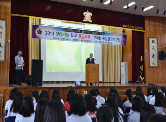 민주평통 상주시협의회(회장 김종준)에서는 6월 12일 상지여자 중고등학교 전교생 및 교사, 자문위원 등 700여명이 참석한 가운데 정지희 강사를 초청하여 ‘우리는 통일한국의 주인공’이란 주제로 찾아가는 학교 통일교육을 실시했다.