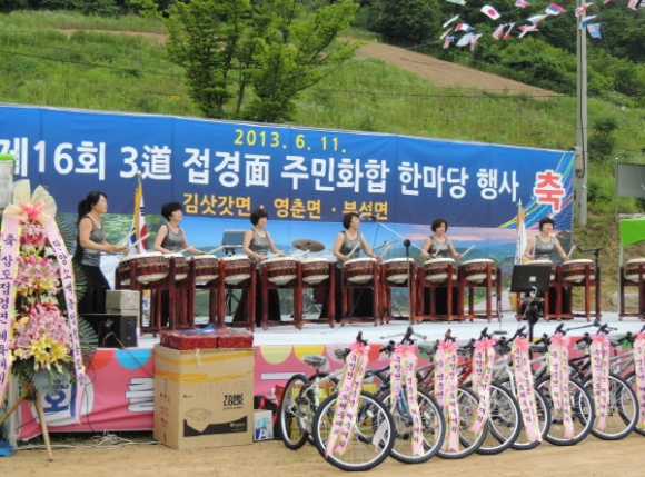 2013년 6월 11일 오전 10시부터 단양 영춘면 하리 “밤수동체육공원”행사장에서 삼도 접경면인 경상북도 영주시 부석면, 충청북도 단양군 영춘면,강원도 영월군 김삿갓면 3개면 주민들 1,000여명이 참석한 가운데 “제16회삼도접경 주민화합대회”가 성황리에 열렸다. 단양군 영춘면 주최로 올해 제16회째를 맞은 이번 행사는, 1994년 4월 영춘면에서 열린 제1회 행사를 시작으로 지금까지 삼도접경지역인 영주시 부석면, 단양군 영춘면, 영월군 김삿갓면 3개 면이 번갈아 개최를 해 오면서 3개면 주민 화합에 커다란 도움이 되어 왔다. |  | | | ⓒ GBN 경북방송 | |