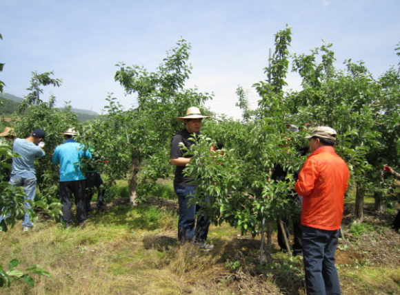 봉현면(면장 전영호)에서는 본격적인 영농철을 맞이하여 일손부족으로 적기 영농작업에 큰 어려움을 겪고 있는 봉현면 유전2리 귀농농가에 6월 13일(목) 직원 13명이 참여하여 막바지에 이른 사과적과 작업 지원에 열과 성을 다했다.