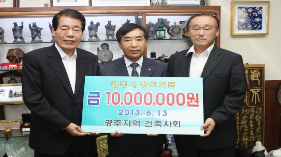 경주지역 건축사회(회장 이동만) 회원 일동이 경주지역 인재양성을 위하여 장학기금 1,000만원을 13일 경주시장학회에 기탁했다.