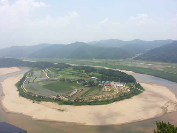 |  | | | ⓒ GBN 경북방송 | | 다음에는 내성천이 비룡산을 350도로 되돌아 흘러가며, 용의 비상처럼 물을 휘감아 돌아간다고 붙여진 회룡포(回龍浦)로 향했습니다. 비룡산(飛龍山)에 오르니 육지 속 섬마을의 모습이 선명하게 보였고, 모래밭에 펼쳐진 산과 강은 태극모양으로 조화를 이루고 있었습니다. 옛날 신라는 삼국통일 직후 국태민안을 위해 장안사를 세 곳에 창건하였다고 합니다. 북쪽 금강산과 남쪽 기장 불광산 그리고 중앙의 이 곳 용이 승천하는 비룡산입니다. 회룡포에 내려가 콩불고기와 야채, 버섯 등 고기 한점 없이 준비된 꿀맛 같은 점심을 먹고 나서는 냇가에 숨어있는 쓰레기를 주으면서 자연과 함께하는 대자연의 일원임을 확인하였습니다.
