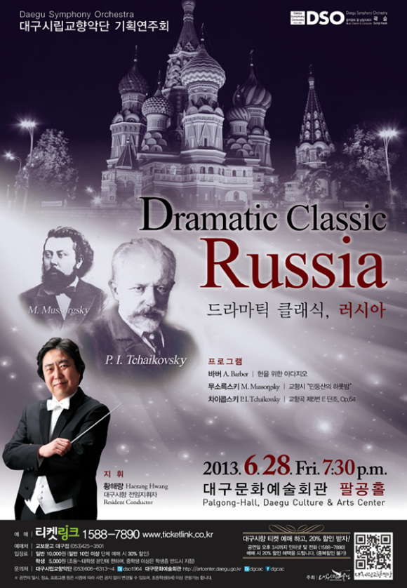 |  | | | ⓒ GBN 경북방송 | | 대구시립교향악단(이하 대구시향)은 오는 28일(금) 저녁 7시 30분 대구문화예술회관 팔공홀에서 기획연주회 “드라마틱 클래식, 러시아”를 연다. 무더운 여름밤을 달래줄 러시아의 시원한 클래식 음악들로 채워질 이날 공연에선 무소륵스키와 차이콥스키 작품을 선보인다. 19세기 동시대를 살았던 러시아의 대표적인 작곡가 무소륵스키와 차이콥스키. 그러나 이들이 추구했던 음악 성향은 판이하게 달랐다. 이번 연주회는 이 두 작곡가의 특색 있는 작품을 통해 러시아 클래식 음악의 매력을 느껴볼 좋은 기회다.