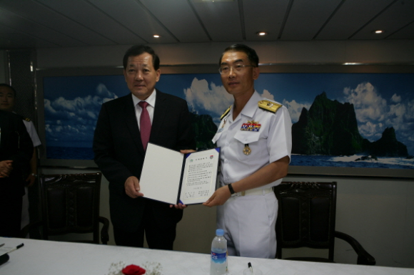 성주군(군수 김항곤)과 해군작전사 제5성분전단(전단장 박동우 준장)은 17일 해군제5전단 독도함에서 도정태 성주군의장 및 군의원, 사회단체장, 성주군해군동지회 임원 등이 참석한 가운데 자매결연식을 갖고 상호발전 및 협력을 위해 노력하기로 했다.