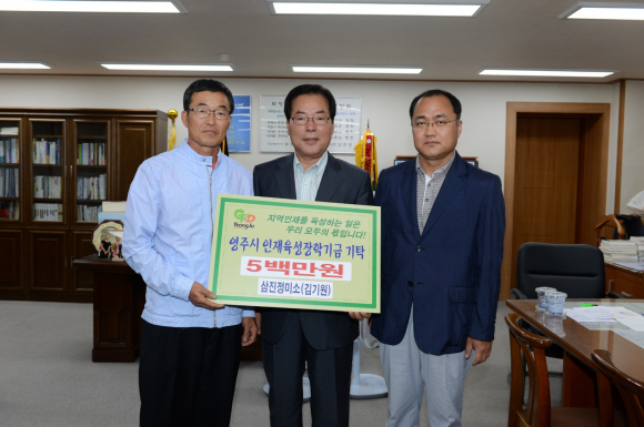 삼진정미소 대표 김기원씨가 18일 (재)영주시인재육성장학회 오백만원을 기탁
