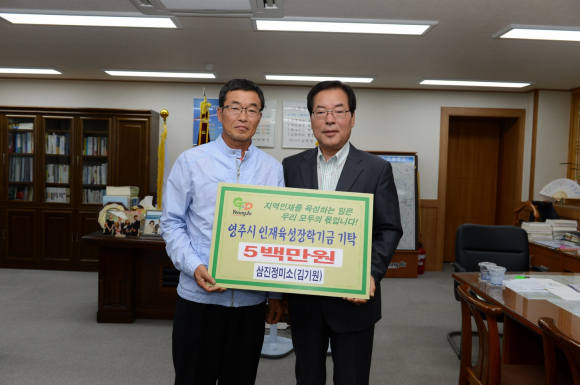 창진동 삼진정미소 대표 김기원씨가 18일 (재)영주시인재육성장학회를 방문해 오백만원을 기탁했다. 김기원대표는 서부초등학교에도 매년 도서기증과 함께 장학금을 주고 있고 제일고등학교에도 장학금을 주는 등 왕성한 봉사활동을 하고 있으며 동네일에도 앞장서는 등 주민들에게 귀감이 되고 있으며 지난 2009년부터 2012년까지 1천3백만원의 장학금을 기탁한바 있다