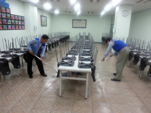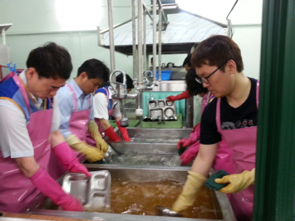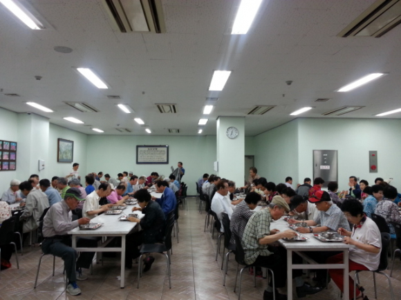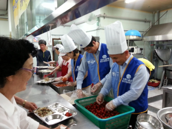 12시 정각에 배식이 시작되고 줄을 지어 기다리시던 어르신들이 차례로 들어오시는데 그 모습은 각양각색입니다. 한 분 한 분 들어오시는 분의 모습과 표정에서는 그간 살아오신 모습이 입혀져 있습니다. 배식을 하면서 “맛있게 드십시오.” 라고 하면 답 또한 그야말로 백인백색입니다. 들어오시는 모습만을 보고도 어떤 답을 하실지 알아 맞추기도합니다. 대개 누님(?)들의 답은 “고맙습니다, 감사합니다, 잘 먹을께요, 오늘 대구은행에서 오셨네, 젊은 오빠들이 와서 밥맛 좋겠네.”입니다. 반대로 형님(?)들은 부끄러움이 많으신지 우리의 인사에는 답도 없이 무표정한 분이 대부분이십니다. 가끔 밝고 활기차게 답을 해주시는 분도 계시지만 고개만 끄덕이시는 분들이 많습니다. 언젠가는 안주가 좋은데 왜 술이 없냐시며 혼을 내기도 하였습니다. 그 현장에서 우리는 남자보다 여자들이 오래 사는 이유의 답을 찾아 냅니다.