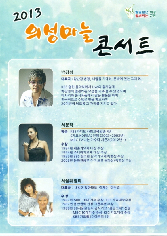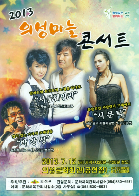 |  | | | ⓒ GBN 경북방송 | | 의성군(군수 김복규)은 2013. 7. 12. 19:30 문화체육회관에서 제2회 세계의성마늘축제 콘서트를 공연키로 했다.