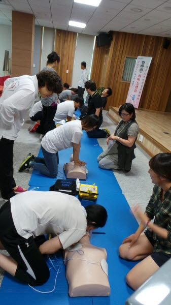 이번교육은 강사 자격을 갖춘 보건소 직원들이 새빛병원 직원들과 고혈압・당뇨등록교육센터 직원들을 대상으로 일상에서 일어나기 쉬운 소아 및 성인 심정지 환자 발생시 심폐소생술과 자동제세동기 사용방법, 이물질에 의한 기도폐쇄 등의 내용으로 교육을 실시했다.