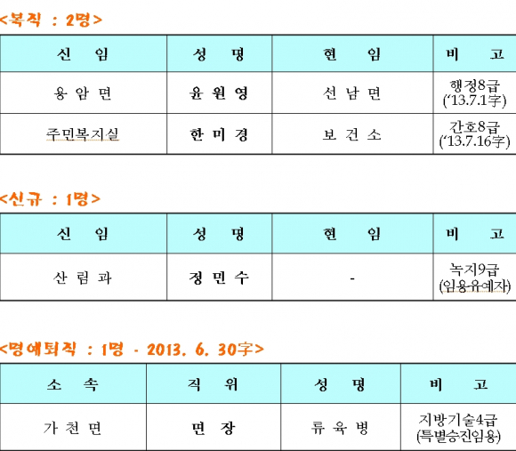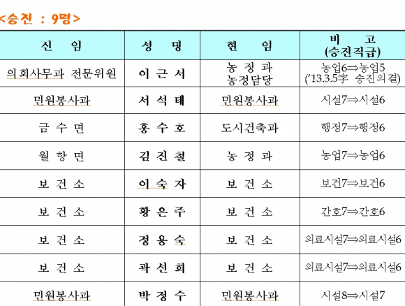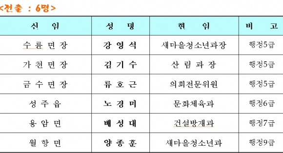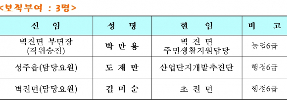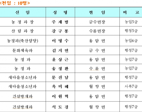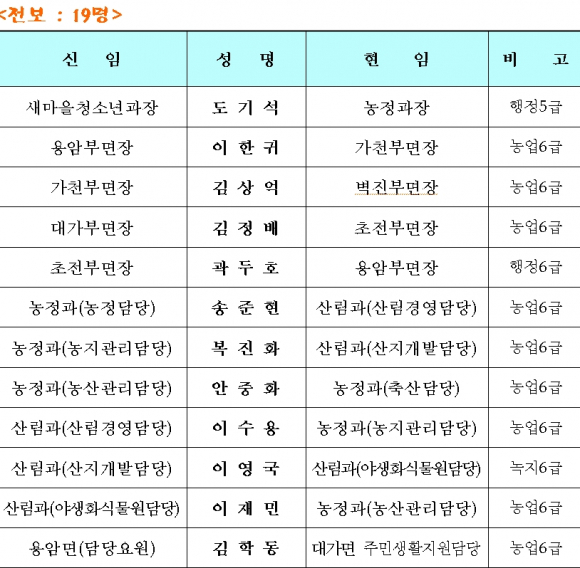 총52명, 승진9, 보직부여3, 전입10, 전출6, 전보18, 복직2, 신규1, 명예퇴직1(6.30字), 공로연수1]