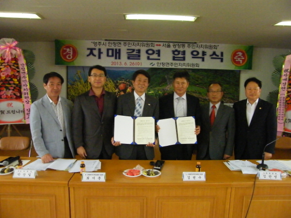 영주시 안정면과 서울시 광장동이 지역교류 활성화와 공동 발전을 위해 손을 잡았다. 두 지역 주민자치위원회는 6월26일 면사무소 회의실에 53명(안정면 30, 광장동 23)이 참석한 가운데 자매결연 협약식을 갖고 앞으로 농촌체험, 직거래장터 운영, 마을 일손돕기 등을 지속적으로 실시하여 도·농간 상생발전을 위해 힘을 모으기로 합의했다.