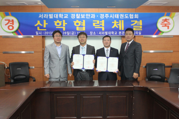 서라벌대학교(총장 김재홍) 경찰보안과는 경주시태권도협회(회장 이상문)와 지난 2013년 6월 28일 11시 서라벌대학교 본관 영상회의실에서 ‘산학협력 협약’을 체결했다.