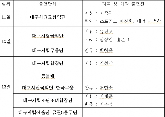 이번 공연은 음악평론가 최영애의 진행으로 대구시립예술단 5개 단체(대구시립교향악단, 대구시립합창단, 대구시립국악단, 대구시립무용단, 대구시립소년소녀합창단)와 대구시립예술단 예능연구단원들로 구성된 금관5중주단, 지역풍물패인 등불패가 매일 색다른 무대와 다양한 볼거리를 제공할 예정이다.