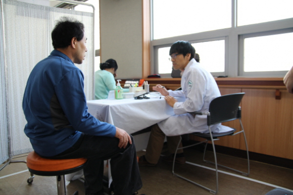 오전 10시부터 복지관 2층 강당과 검진차량에서 실시되는 무료검진은 30여명의 복지관 이용자를 대상으로 오전, 오후 두 그룹으로 나누어 진행되며, 내과, 안과, 정형외과 일부영역에 대해 15명의 의료진들이 접수, 기초검진, 진료검진, 처방 순으로 진료한다.