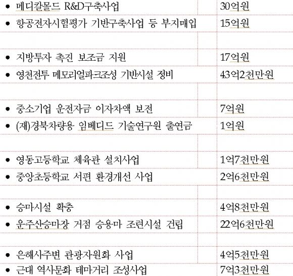 이번 추경예산은 시정현안사업의 원활한 추진을 위해 불요불급한 사업의 사업비 조정과 경상경비 자율절감을 통해 우선적으로 정부와 경상북도 추경에 따른 국도비 보조내시된 사업을 중점 반영하고, 항공전자시험평가센터 기반구축사업 및 경마공원 진입도로 등 대규모 사업예산 반영,