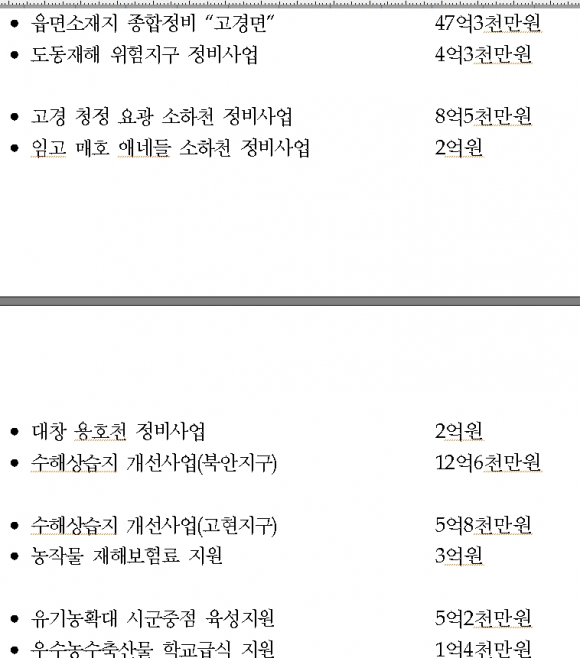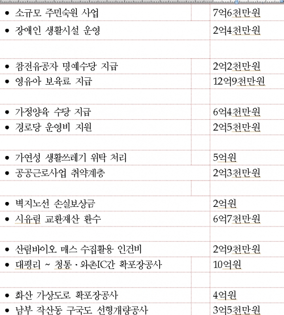 주민숙원사업, 재해예방 및 복구 등 민생 현안사업과 영유아 보육료 지원 및 취약계층 복지강화 등을 통한 사회복지분야 예산 확대로 어려운 재정 여건 속에서도 저소득층 생활 안정과 일자리 창출을 위해 예산을 적극 반영했다.
