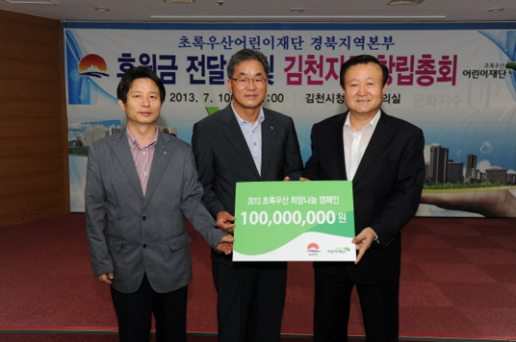 김천시는 7월 10일 시청 2층 회의실에서 초록우산 어린이재단 경북지역본부 약정후원금 전달식과 함께 경북후원회 김천지회 창립총회를 가졌다.