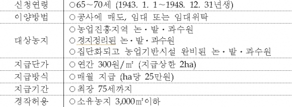 대상 조건은 2013년 12월 31일 현재 65세이상 70세이하(1943.1.1.~1948.12.31.출생)인 농업인으로서, 10년 이상 계속해 농업경영을 하고, 경영이양이전에 3년이상 계속해 소유한 농업진흥지역의 논․밭․과수원 을 한국농어촌공사에 경영이양할 경우 매매대금 또는 임대료와는 별도로 ㎡당 300원/연(한도 6백만원), 최장 75세까지 보조금을 지급하는 사업이다.