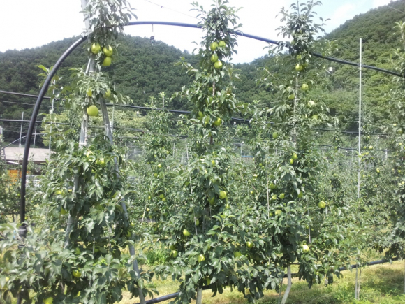 영천시에서 개발 중인 “영천식 톨스핀들 수형 시스템”은 생산성이 높고 고품질의 사과를 생산함으로 사과농가들의 소득향상이 기대된다.
