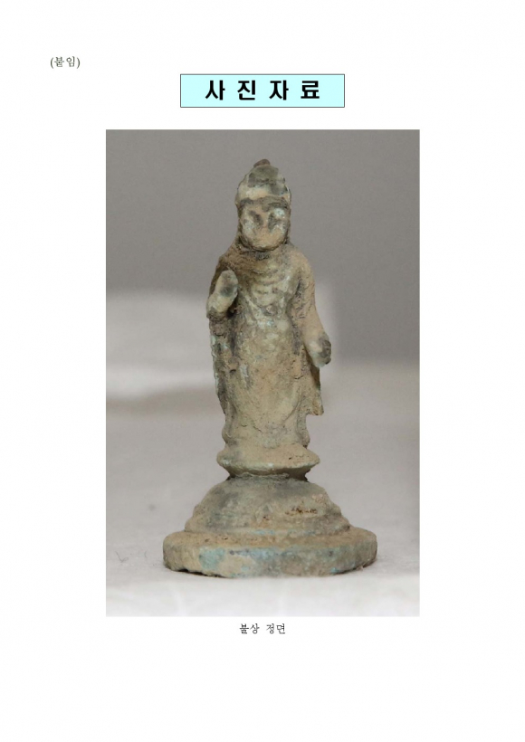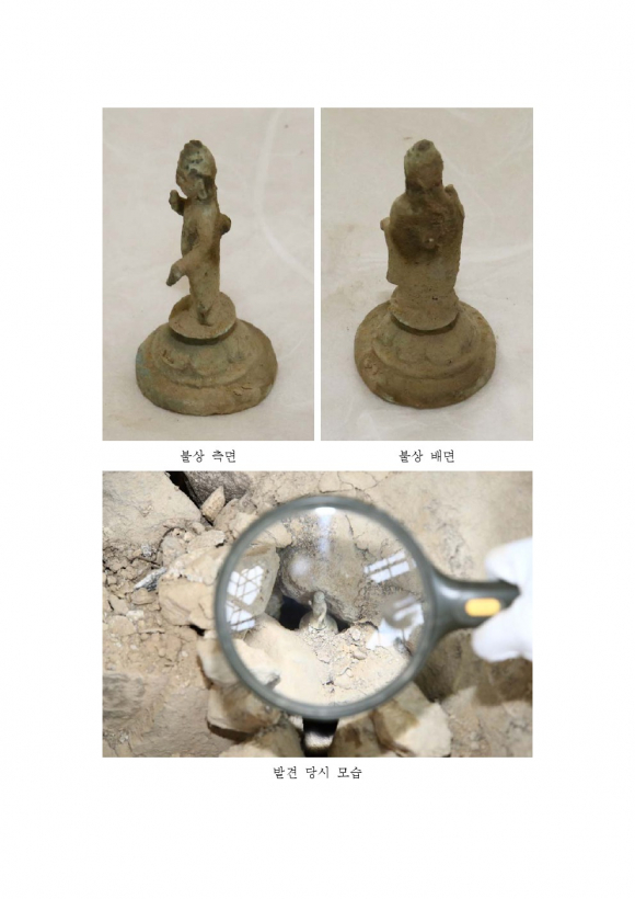 수습된 불상은 통주식(通鑄式)으로 주조된 소형 금동불입상으로 높이 4.6㎝, 대좌지름 2.3㎝ 크기이며, 도금 흔적이 미세하게 확인된다. 법의(法衣)는 통견식(通肩式, 양쪽 어깨를 모두 덮는 형식)으로 착의하고, 양손은 일부 훼손되었으나 시무외ㆍ여원인(施無畏ㆍ與願印, 通印)을 결하고 있다. 상호(相好, 부처님의 얼굴) 역시 훼손되어 알아보기 어려우나 동그란 얼굴에 육계(肉髻, 머리 위에 튀어나온 부분)가 우뚝하게 표현되어 있고, 등 뒤에는 광배(光背, 부처의 몸에서 나오는 빛을 형상화한 것)를 꽂았던 것으로 추정되는 촉이 돌출되어 있다.