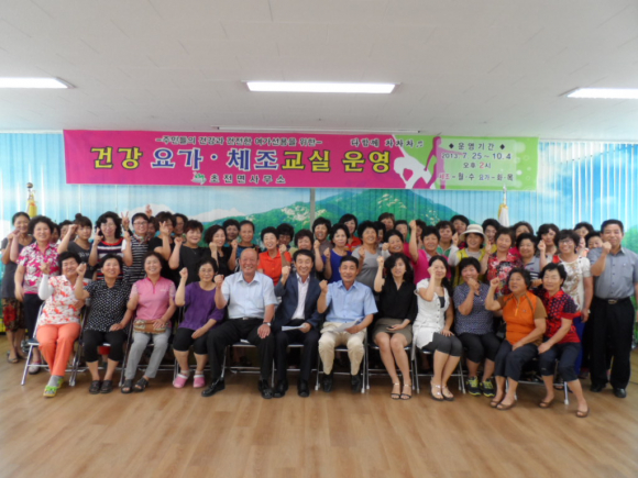 이번 건강교실은 2013. 7.29 ~ 10.4일까지 운영되며, 매주 월·수요일은 건강체조, 매주 화·목요일은 건강요가를 실시하며. 모집 첫날부터 지역주민들의 큰 인기로 신청자가 너무 많이 몰려 부득이 2개반으로 늘려 실시 할 예정에 있다.
