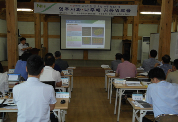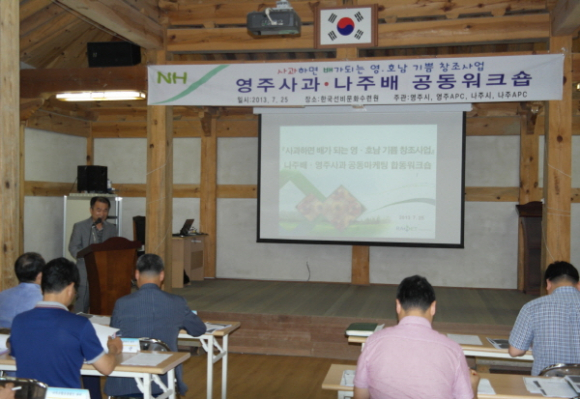 영주시에 따르면 지난해 대통령직속 지역발전위원회의 창조지역 공모사업에 선정된 “사과하면 배가 되는 영․호남 기쁨 창조사업”의 성과 극대화를 위해 유통업체, 양 지자체, APC, 컨설팅업체 관계자 합동 워크숍을 통하여 추석 명절 신선과실 및 사과․배 혼합세트 판매전략, 소비 트렌드에 맞는 브랜드 및 맞춤형 포장재 개발, 공동 판촉활동 활성화 방안 등에 대해 심도 있게 논의를 하여 사업이 조기에 안착되도록 한다는 것이다.