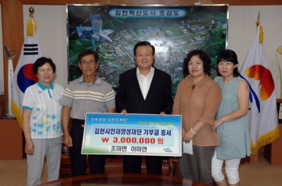 김천시 조마면 이미연씨(전 한국자유총연맹 조마면여성회 회장)는 시어머님의 장례식을 치르고 남은 금액 3백만원을 김천시인재양성재단에 기탁해 주변에 귀감이 되고 있다.