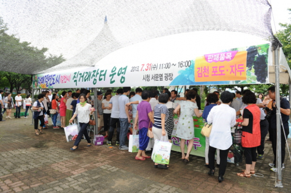 김천시는 지난 7월 31일 자매도시 군산시를 찾아가 김천포도·자두 직거래 행사를 개최했으며, 준비한 물량이 순식간에 판매되는 등 직거래 행사가 군산시민들로부터 큰 호응을 얻었다고 밝혔다.