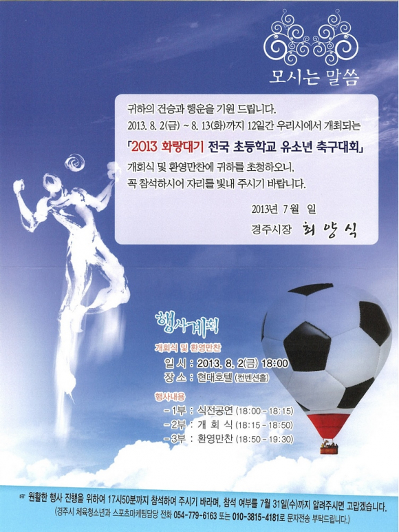 경주시는 오는 17일부터 22일까지 6일간『2013경주국제유소년(U-12)축구대회』를 개최해 국제적인 문화․관광 스포츠 도시로서의 위상을 드높인다.