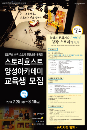 지난 6월 한국콘텐츠진흥원이 주관한 2013년 지역스토리창작센터 육성 지원사업에 선정되어 진행되는 이번 교육은, 지역에 산재된 스토리(인물·민담·설화 등)에 로컬푸드를 결합한 창작스토리를 개발하고 알릴 지역의 전문 인력양성을 위한 교육으로 진행하게 된다.