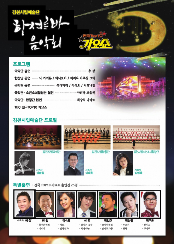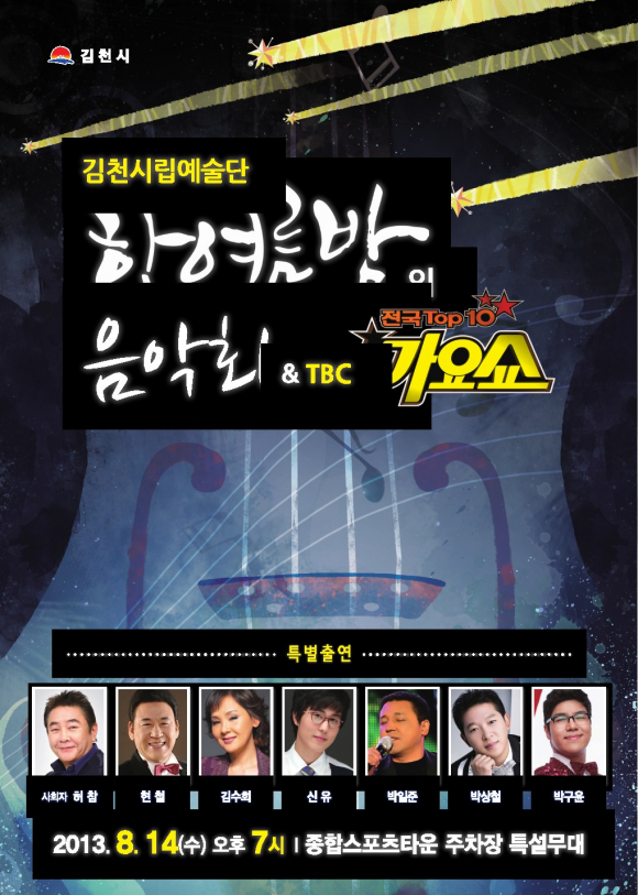 김천 |  | | | ⓒ GBN 경북방송 | | 시는 오는 14일(수) 오후 7시 김천스포츠타운 주차장 특설무대에서 한여름밤의 무더위를 식혀줄 ‘시립예술단 한여름밤의 음악회 & TBC 전국 TOP10 가요쇼’를 개최한다.