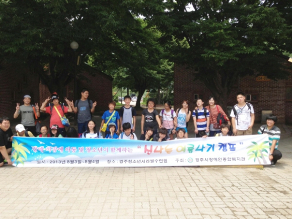|  | | | ⓒ GBN 경북방송 | | 산대초등학교(교장 김영환) 교육복지실에서는 8월 3~4일 1박2일 동안 산대초등학교 자원봉사단 학생들과 경주시장애인종합복지관 장애학생들이 참가한 가운데 “한마음 통합캠프”를 실시했다.
