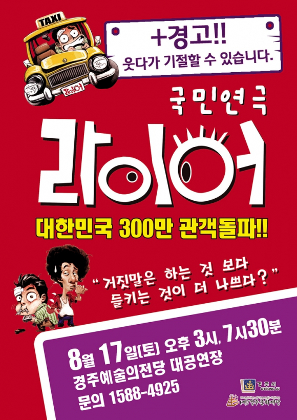 17일 경주시가 주최하고 경주문화재단이 주관하여 한여름, 반전에 반전을 더한 웃음 폭탄으로 경주시민들의 무더위를 날려 버리기 위해 기획한 공연 국민연극 라이어가 경주예술의전당 무대에 오른다.