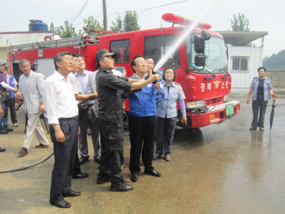 경주소방서(서장 김학태)는 10일 오후 김관용 경상북도지사 등이 방문한 가운데 관내 폭염농장에 대한 현장방문을 실시했다고 밝혔다. 이날 폭염농장 현장방문은 여름철 폭염으로 고통받고 있는 농장 사육시설에 대한 살수지원 및 공공기관 차원에서 폭염에 대비 가축들의 피해를 줄일 수 있는 방안을 논의하고 폭염으로 고통받고 있는 농장주를 위로하기 위해 마련됐다. 한편 경주소방서는 지난 10일부터 안강읍, 천북면 일원의 축산농가에 소방차량 4대를 동원, 80t의 살수를 지원하고 있다. 경주소방서 관계자는 “계속되는 폭염으로 인한 가축피해를 방지하기 위해 앞으로도 요청하는 농가 등에 대해 살수지원을 계속할 계획”이라고 밝혔다. |