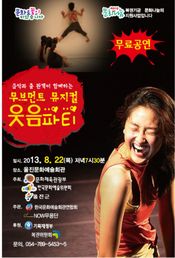 울진군(군수 임광원)은 복권기금 문화나눔의 지원사업으로 추진되는 2013년 지방문예회관 특별프로그램 개발지원사업 우수공연 프로그램중 무브먼트 뮤지컬‘웃음파티’를 22일 오후 7시 30분에 울진문화예술회관 무대에 올린다.