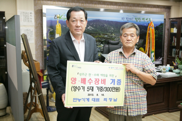 |  | | | ⓒ GBN 경북방송 | | 대구시 달성군 서재리에 소재한 만농기계 최창남(60세)사장은 8월16일 성주군을 방문해 빈번하게 발생되는 한해 및 지난해 일어난 태풍 “산바”등 수해 발생시 응급복구에 애로가 많은 이야기를 듣고, 재해예방을 위해 써달라며 엔진일체식 양수기 3인치 5대(3,000천원 상당)를 기증 했다. 최창남 사장은 김천이 고향으로 2007년 대구시 서재리에서 만농기계 회사를 설립하여 스프링클러, 구제역방제기 등을 생산하는 회사로 각종 재해발생시 돕고 싶은 마음만 앞섰지만 도울 방법을 찾지 못해 안타까웠다며 “이번에 이것이라도 보낼 수 있어 보람을 느낀다”며, 여건이 되면 앞으로 조금씩이라도 성주군민들을 위해 재해장비를 지원하고 싶다”는 뜻도 밝혔다. 또한 운영중인 회사를 금년도 8월말경에 관내 선남면 신부리로 이전할 계획이다.