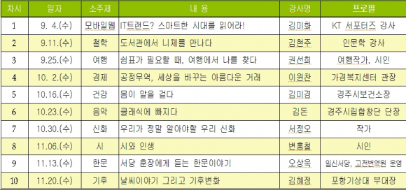 |  | | | ⓒ GBN 경북방송 | | 경상북도립외동공공도서관(관장 김미경)은 오는 9월 4일, 제3회<교양만점 엄마학교>의 문을 연다. 학부모들의 통섭적 교양 쌓기 시간을 마련하기 위해 2012년부터 진행되어 온 ‘교양만점 엄마학교’는 철학, 종교, 사회과학, 자연과학, 기술과학 등 한국십진분류(KDC)에 맞춘 10개의 주제 선정과 각 분야 전문가들로 구성된 강사진을 갖추고 있어 학부모들의 뜨거운 호응을 받아왔다. 도서관은 <교양만점 엄마학교>를 통하여 시간이 흐를수록 자꾸만 좁아져 왔던 지식과 관심의 주제 분야를 넓히고 융합하는 통섭적 교양에 대해 알려주고 있다. 이러한 통섭적 사고는 학부모의 소양 함양과 더불어 자녀교육에도 큰 도움이 될 것이다. 이 프로그램은 ‘IT 트랜드? 스마트한 시대를 읽어라!’라는 주제를 시작으로 ‘도서관에서 니체를 만나다’, ‘쉼표가 필요할 때, 여행에서 나를 찾다’, ‘공정무역, 세상을 바꾸는 아름다운 거래’, ‘클래식에 빠지다’ 등 10가지 다양한 주제를 가지고 11월까지 진행될 예정이다. |  | | | ⓒ GBN 경북방송 | |