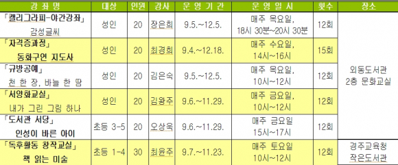이밖에도 도서관에서는 ‘「캘리그라피」감성글씨’, ‘「자격증과정」동화구연지도사’ 등 다양한 하반기 평생교육강좌가 9월부터 12월까지 진행될 예정이다.
