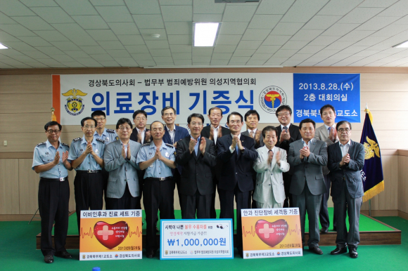 법무부범죄예방위원 의성지역 협의회(회장 이상문)는 28일(수)16:00 경북북부제3교도소에서 경북의사회(범방의성지구회장 정능수)와 연계하여 경북북부제1교도소와 제3교도소 제소자들을 위한 이비인후과 및 안과 진료용 의료장비 각1대와 안과진료 결과 안경착용이 필요하나 자력으로 구입이 어려운 제소자를 위한 안경구입기금 100만원을 전달하고 재소자들이 사회의 따뜻한 관심을 바탕으로 출소하면 또 다시 범죄하지 않고 성실히 살아가도록 격려했다.