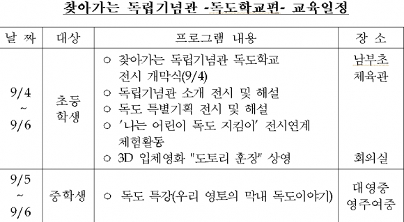 영주여자중학교와 대영중학교 학생을 대상으로는 ‘우리 영토의 막내 독도 이야기’ 를 주제로 독립기념관 한국독립운동사연구소 연구위원이 독도 특강을 실시한다.