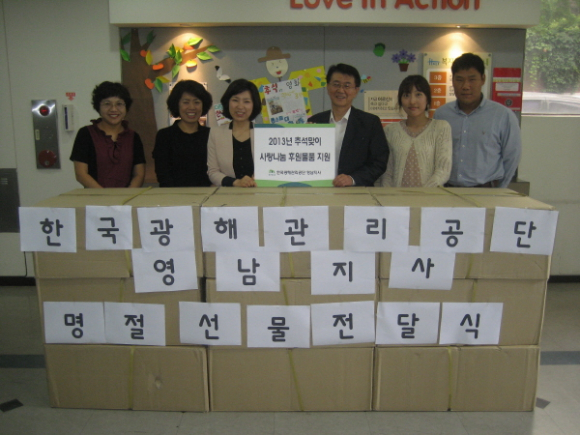 소외된 이웃에 사랑의 물품을 전달하여 우리 사회의 나눔문화 확산에 기여하고자 마련된 이번 행사에서는 편모가정 25가구와 독거노인, 소년소녀가장 등 무료급식 대상자 100명에게 전통한과 및 조리김이 후원물품으로 전달되었다.