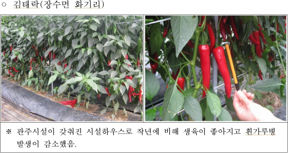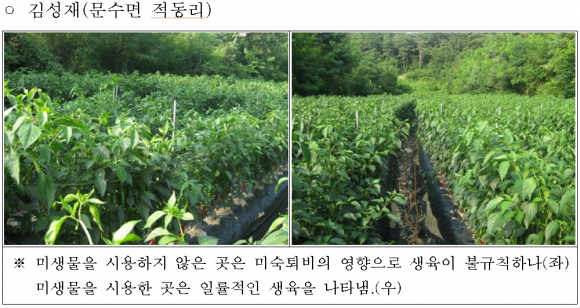 특히 문수면 김○○씨 농가의 경우 미숙퇴비가 시용된 노지 고추밭에 유용미생물을 시용한 결과 미숙퇴비에 의한 생육장해 현상이 완화됨을 확인하였고, 장수면 김○○씨 농가는 관주시설을 갖춘 고추하우스시설에 유용미생물을 관주하여 고추의 품질향상 및 흰가루병 발생 감소 등 효과가 있었음을 확인했다.