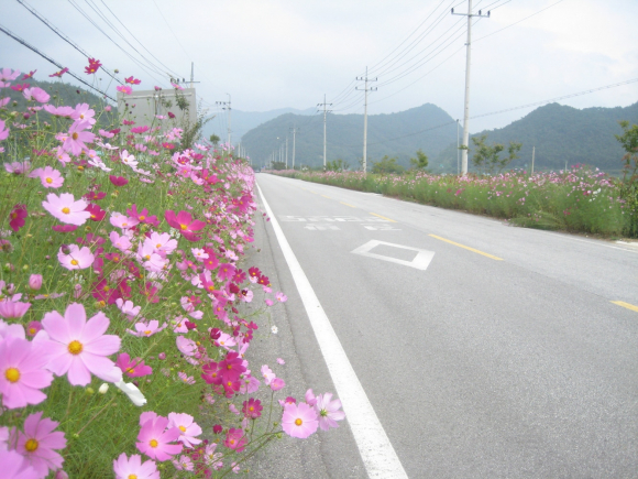 국도 36번 길, 창평리에서 목재 체험관으로 가는 길과 봉성면 일대 곳곳이 코스모스로 장관을 이루고 있다.
