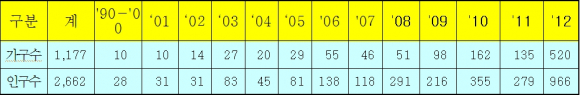 최근 3년간의 실적을 살펴보면 2010년 162세대 355명, 2011년 135세대 279명, 2012년 520세대 966명으로 2011년 가구대비 260%, 인구대비 289%가 증가했다.