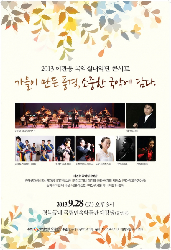 [공연정보] 공연명: 이관웅 국악 실내악단 콘서트 - ‘가을이 만든 풍경, 소중한 국악에 담다’ 공연장: 경복궁 내 국립민속박물관 대강당(공연장) 공연일시 : 2013. 9. 28(토) 오후 3시 관람료: 모든 자리 무료 문의 : 국립민속박물관(02-3704- 3110)