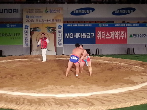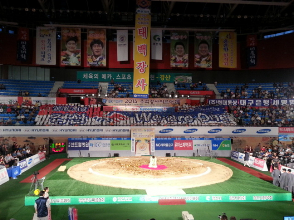 씨름대회 기간 내내 경산실내체육관은 관중들의 열기와 선수들의 현란한 기술 그리고 황소 같은 뚝심이 모래판을 달구었습니다. 백두장사 경기에서는 150Kg의 거구가 힘을 소진하고 기진맥진한 상태에서 정신력으로 대전하고 있었습니다. 어느 한 순간 방심을 하는 틈이 보이면 전광석화처럼 온 힘을 다해 상대를 제압하기도 했습니다. 어이없이 패하면 얼마나 허무할까 하는 생각해보았습니다.